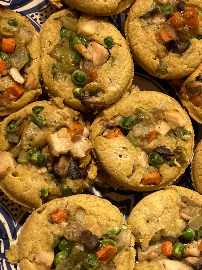 - Step 2 In a large cast-iron or heavy skillet, heat the oil over medium high heat until hot, then saute the onion until it softens. Add carrots, mushrooms, celery, salt and pepper to taste, thyme and sage. Cook, stirring occasionally, until golden, 8 to 10 minutes. Stir in green peas. Stir in the flour and cook, until incorporated, about 2 minutes. Pour in the stock and bring to a boil, then stir in the chicken. Season the filling with salt and pepper to taste. Place 2 to 3 tablespoons of the filling over each batter-filled muffin tin.