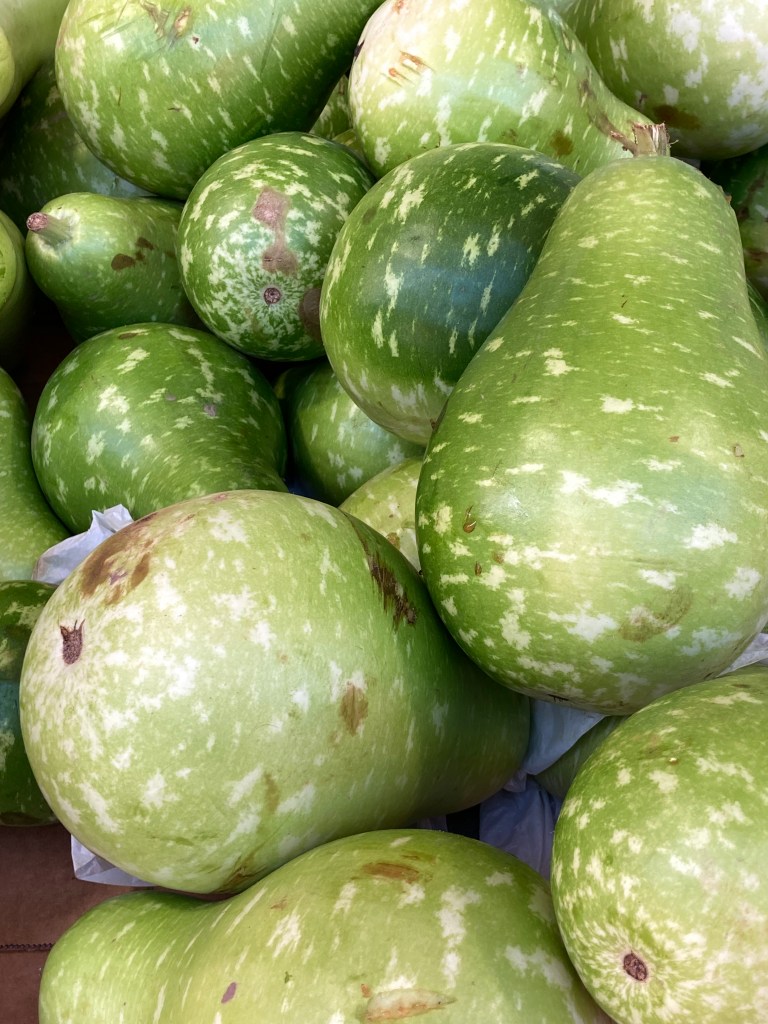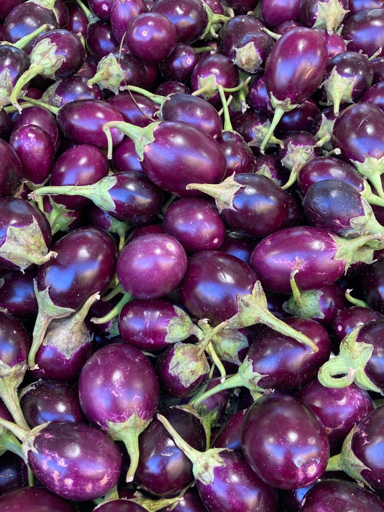 The streets were lined with small grocery stores selling a wide variety of Indian spices, dals & grains and outside the stores, exotic vegetables were displayed on stands including Thai eggplants, small round purple eggplants, Bengali squash, gourds, and heaping boxes of hot green chilies. As I walked slowly through the neighborhood, a delicious aroma of garlic and spices wafted through the air.