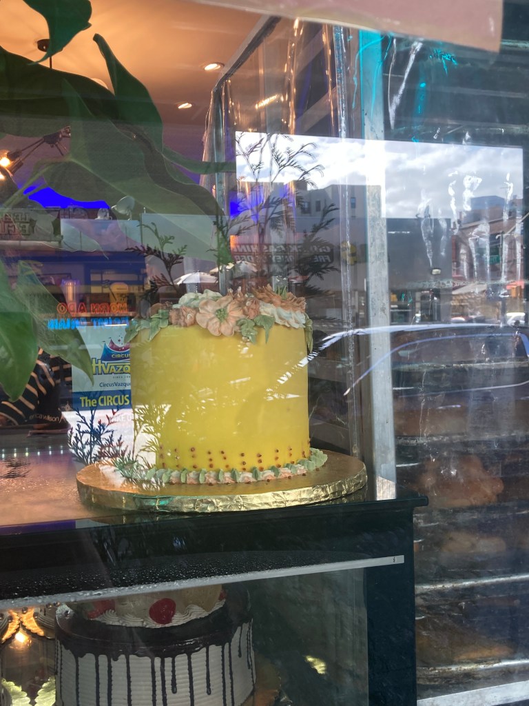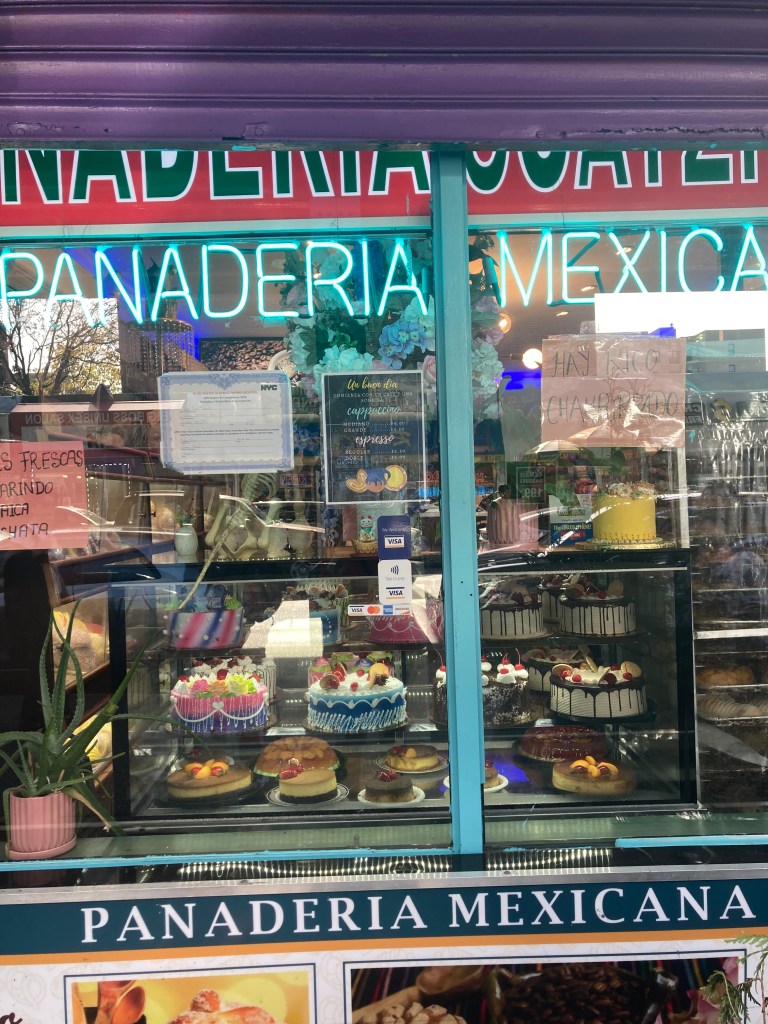 I started to look for an Indian restaurant to order our takeout dinner and was distracted momentarily by a display of colorful cakes in the window of a Mexican bakery and of course I had to go inside. The counter person was a lovely young woman who proudly showed me the different breads , cakes and pastries.