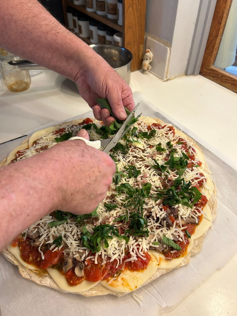 Thomas snipped the leaves and stems of the ramps over the crust that was richly layered with thin slices of provolone, a mixture of shredded cheeses along with tomatoes that Francis had canned last summer.