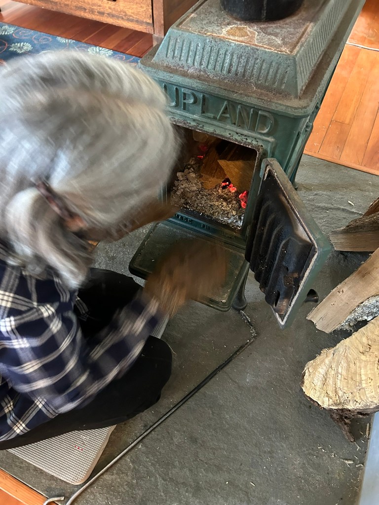 He expertly rinsed off the dirt and grit from a big handful of leeks with plenty of cold water while Francis made a fire to warm us up in her charming little woodstove.