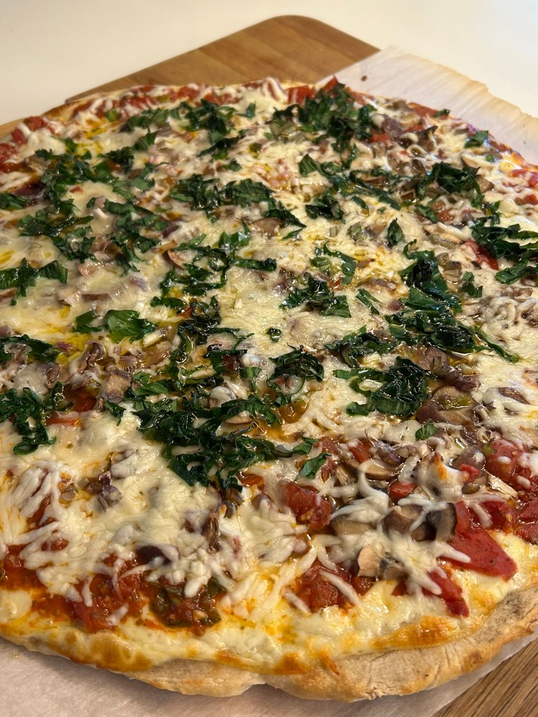 He baked the pizza in a hot oven (500 degrees Farenheit). We enjoyed a wonderful treat! It was simply delicious- crunchy crust and plenty of melted cheese along with the mellow oniony flavor of fresh ramps!!