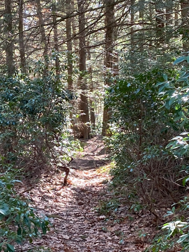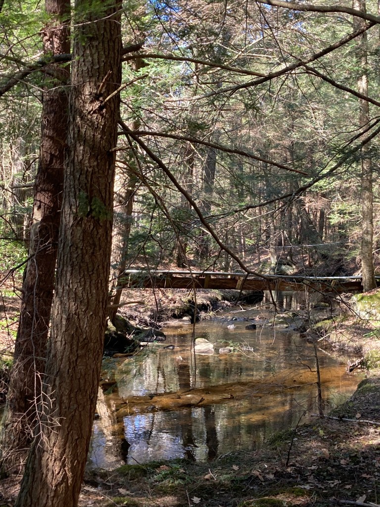 One of my solo walks was at the Fox Brook Preserve in Goshen, CT. on Route 4. I have driven by the tiny entrance to this walk for years on my way to chorus practices and doctor’s appointments in Torrington, CT. Very easy to miss, the trail is a hidden gem complete with a pine forest, large boulders, stone walls, a babbling brook with a suspension bridge, a grove of mountain laurel, a serene pond with hummocks and a small beaver dam!