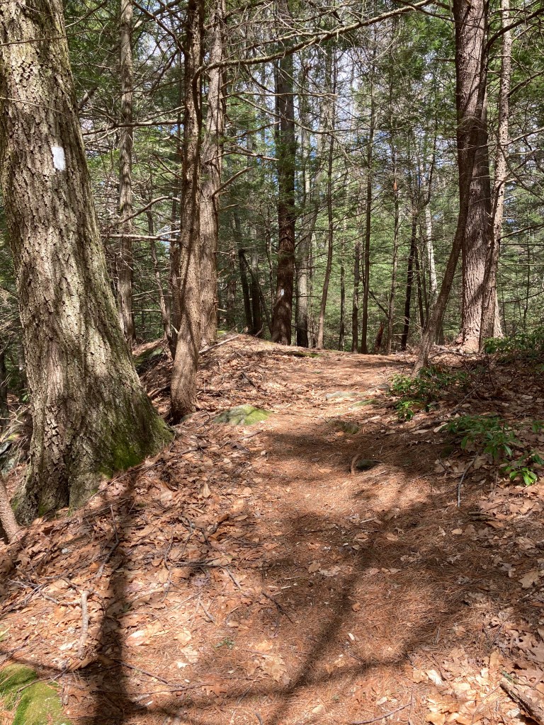 As I entered the woods from the busy highway, this time paying close attention to where I was headed, the trail sloped up gently and transitioned to a peaceful pine forest with large glacial boulders strewn about. The noise of the road faded away quickly.