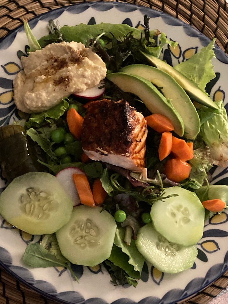 This summer, it’s also once again a great pleasure to visit farm stands and farm markets. One of my favorite places is the Silamar Farm Stand in Millerton, New York. The other day, I bought sugar snap peas, cucumbers, dill, red beets and Sky Farm mesclun mix. With my delicious bounty, I made a summer salad with grilled salmon and creamy hummus. Made with canned chickpeas, garlic, lemon and tahini, the hummus comes together in under 5 minutes. I made a simple salad dressing with olive oil and Carr’s Cider House Cider Vinegar. The vinegar is sweet, not too astringent and tastes almost like a good balsamic vinegar. This along with some crusty French sourdough bread, made a light and delicious summer dinner.