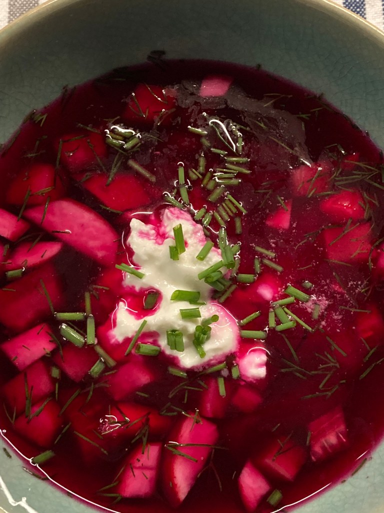 AND: with my bounty of red beets it was time to make Summer Borscht! This is absolutely one of my favorite things about summer. Made with plenty of crunchy cool radishes, cucumber, scallions, dill and a big dollop of yogurt, it is refreshing and delicious alone or better yet with a slice of fresh rye bread. It is also great topped with a sliced hard boiled egg!