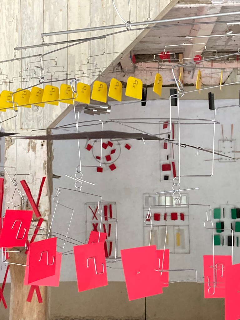 I love playing here- in large part because of our connection with Tim Prentice. It was heartwarming to see his welcoming face and his warm and engaging presence once again! The barn is filled with many of Tim’s sculptures that ripple and weave gently in the crosscurrents of air. Rays of sunshine catch the edges of the works accentuating the bright vibrant colors.