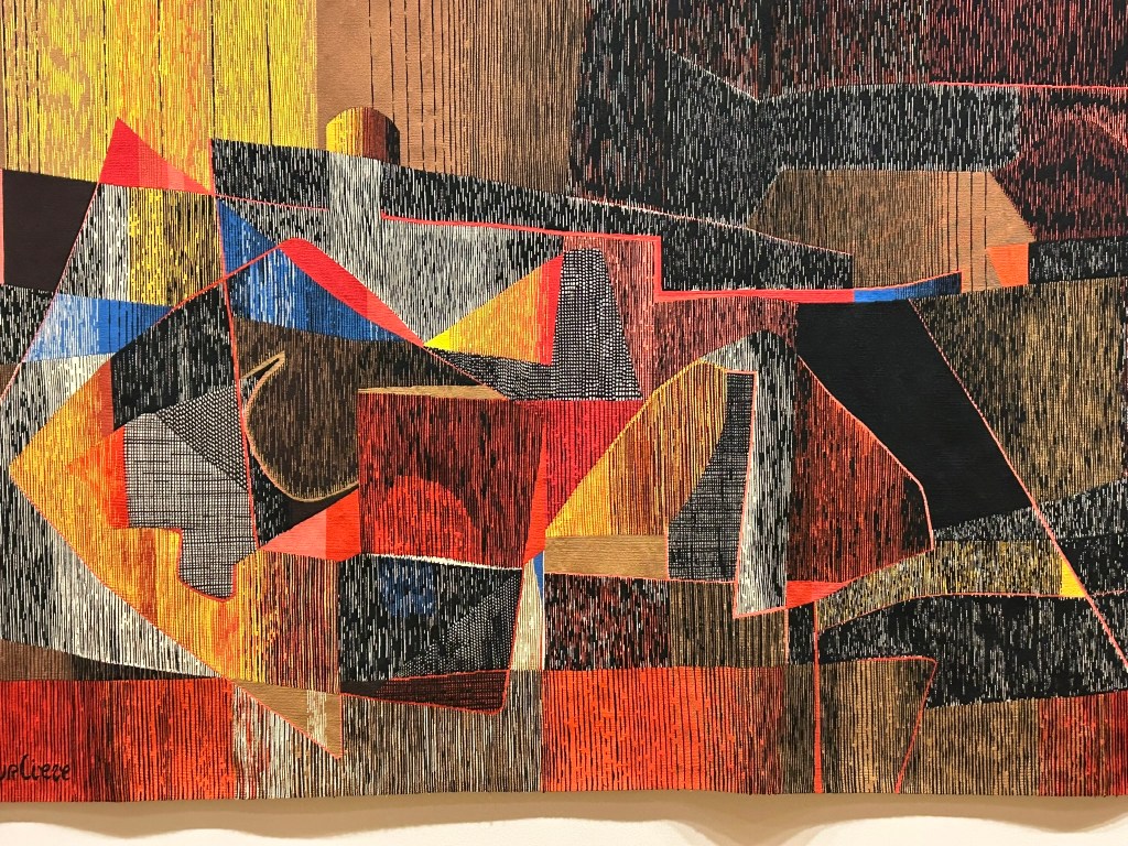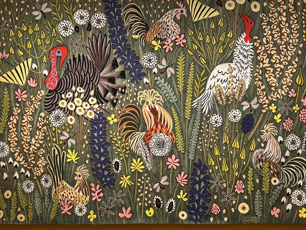 We were delighted to discover a special exhibition at the Clark: Wall Power! Modern French Tapestry from the Mobilier national, Paris. The exhibit displayed a wide range of tapestries created by contemporary artists from the 1920’s to today. Artists, weavers and dyers revived ancient techniques and created bold and daring new works of art. The room was full of brilliant colors and patterns; warming to the soul.