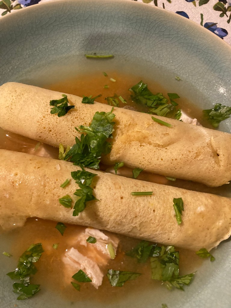 - Sprinkle a generous handful of grated cheese on each crepe and roll it up into a cigar shape. (Divide the cheese evenly among the crepes but save some for garnish). Place the rolled crepes seam down into a large serving bowl. Serve two to three crepes per person and ladle a generous scoop or two of broth on top of the crepes. I also added some of the reserved chicken breast chopped, to the soup. Garnish with a little cheese and chopped parsley. ENJOY!