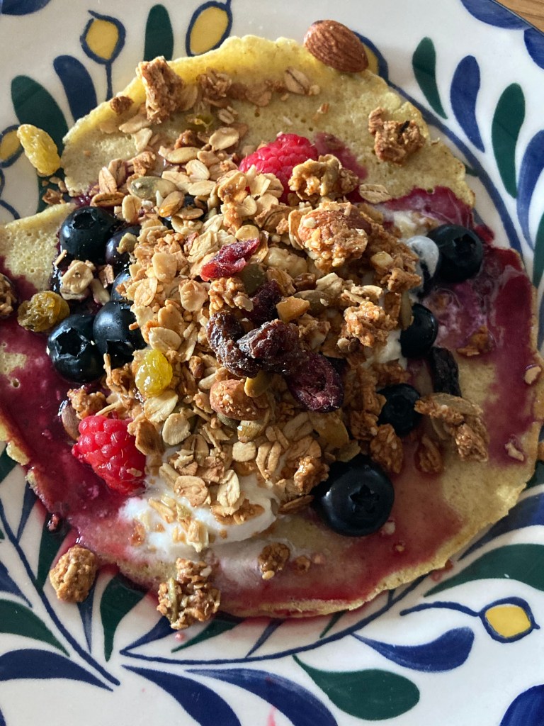 There were a few leftover crepes; the next morning we enjoyed the crepes filled with fresh fruit (whatever you have on hand is good) and plain yogurt. Topped with plenty of crunchy granola and a drizzle of maple syrup, this was an excellent quick breakfast treat!